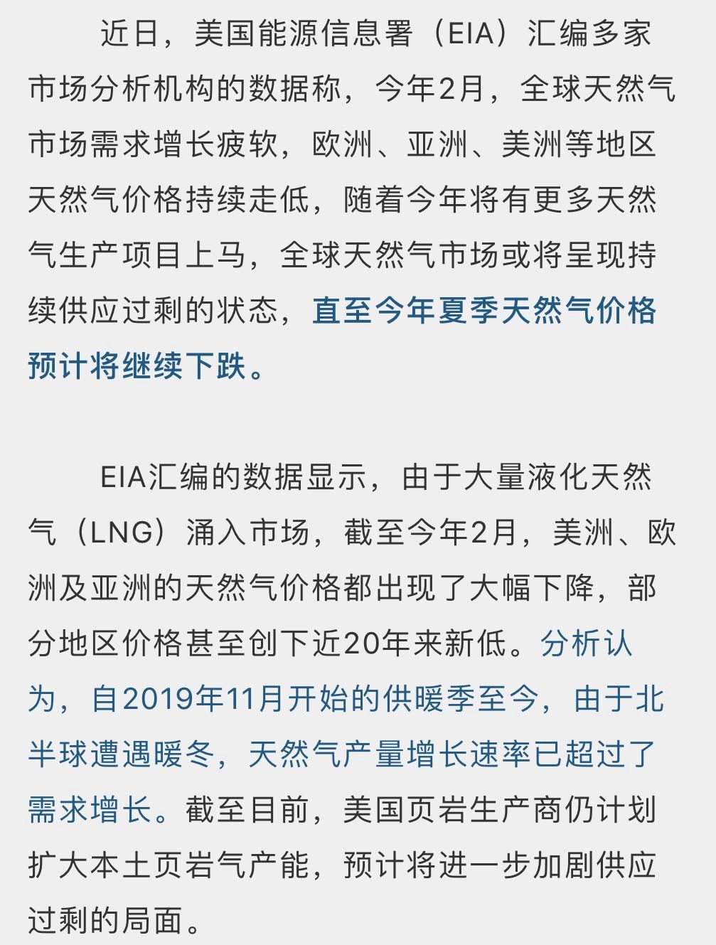 业内人士分析,北半球的暖冬,加上供过于求,又受到疫情影响导致工业用气需求进一步下滑,天然气价格持续承压,不看好2020年天然气价格。